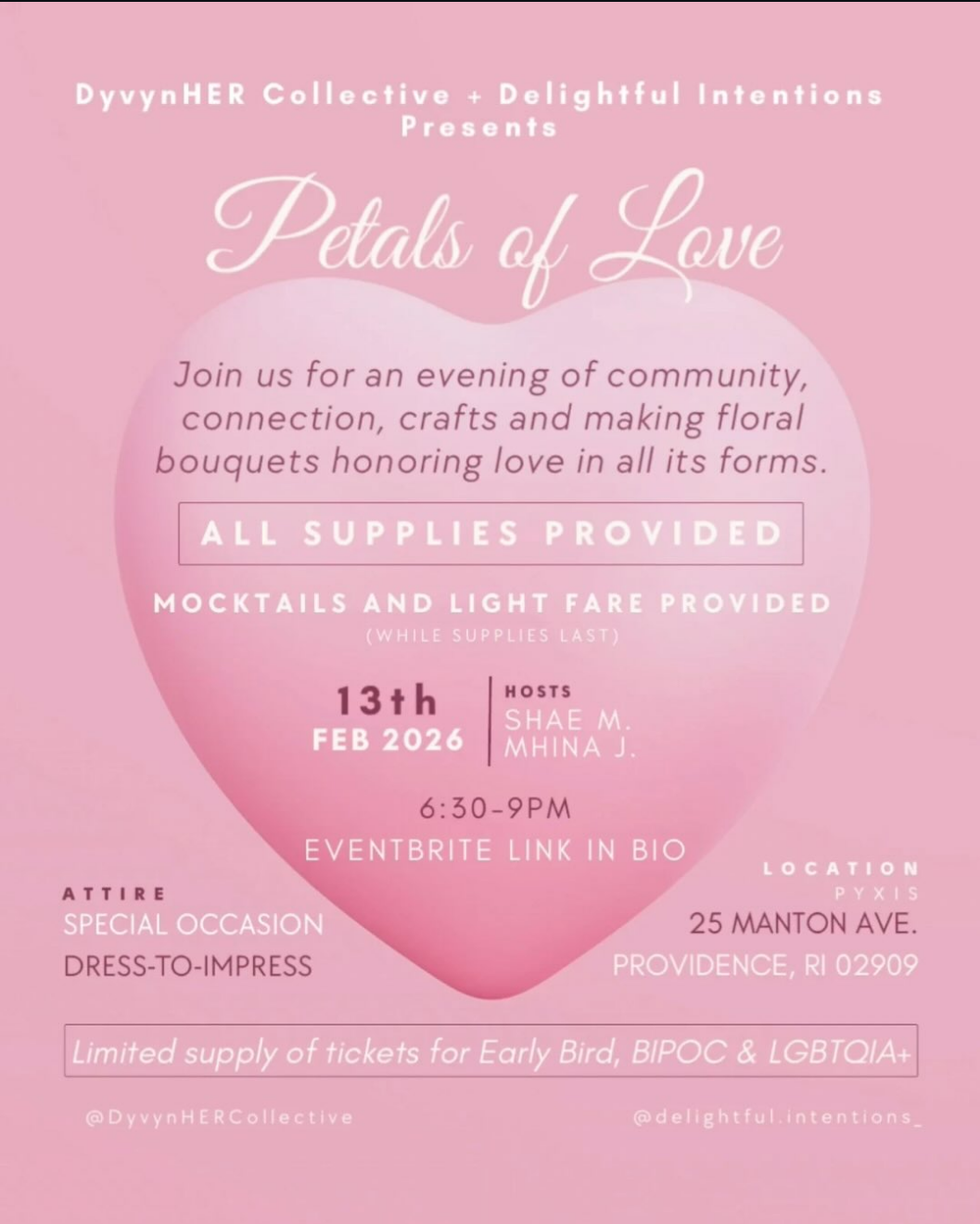 Join us on February 13th, 2026 from 6:30-9pm at Pyxis for Petals of Love, a cozy, creative gathering on Black Love Day/Galentine's/Valentine's/Lupercalia to celebrate love in all its forms: self-love, romantic love, platonic love, familial love, chosen family, love for our pets and communities, and so much more. All are welcome to attend (18+ event).